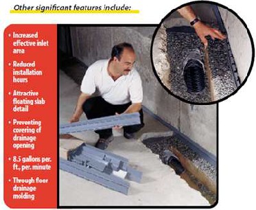 The HOLLOW KICK MOLDING drainage system is by far the most efficient, affordable way to prevent a wet basement from ever occurring, or to assure that previously wet keep dry for good. With its impressive 8.5 gallons per. ft.., per minute of through floor drainage, its effectiveness is unsurpassed. It installs quickly and easily thereby adding to your home or building usable space for living, working and storage. A properly installed HOLLOW KICK MOLD ING drainage system will reduce the possibility of callbacks and complaints from dissatisfied customers.