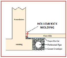 HOLLOW KICK MOLDING is a linear through floor drainage molding installed at the Cove Area where the basement floor slab abuts the interior side of the foundation wall, creating a floating slab. It directs water through the floor and into the drain tile pipe eliminating the possibility of water accumulating on the floor. It also ensures proper air displacement, which will free the water flow through the sub slab piping. It also conceals and protects the drainage opening with an attractive cove plate molding.